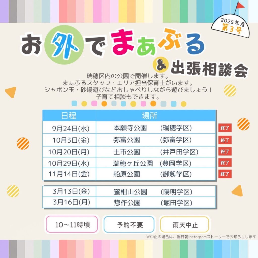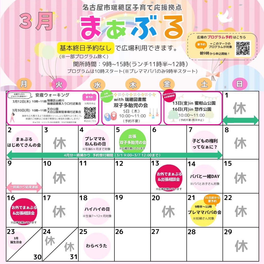 日頃から瑞穂区子育て応援拠点まぁぶるをご利用頂き、誠にありがとうございます。一時預かりの予約が一瞬で埋まってしまうとの声を多くいただきました。1人でも多くのみなさまが一時預かりを利用できるよう検討した結果、一時預かりの予約方法を先着予約から抽選予約に変更することといたしました。それに伴い、ネット申込みのツールがエアリザーブから Google フォームへと変更となります。