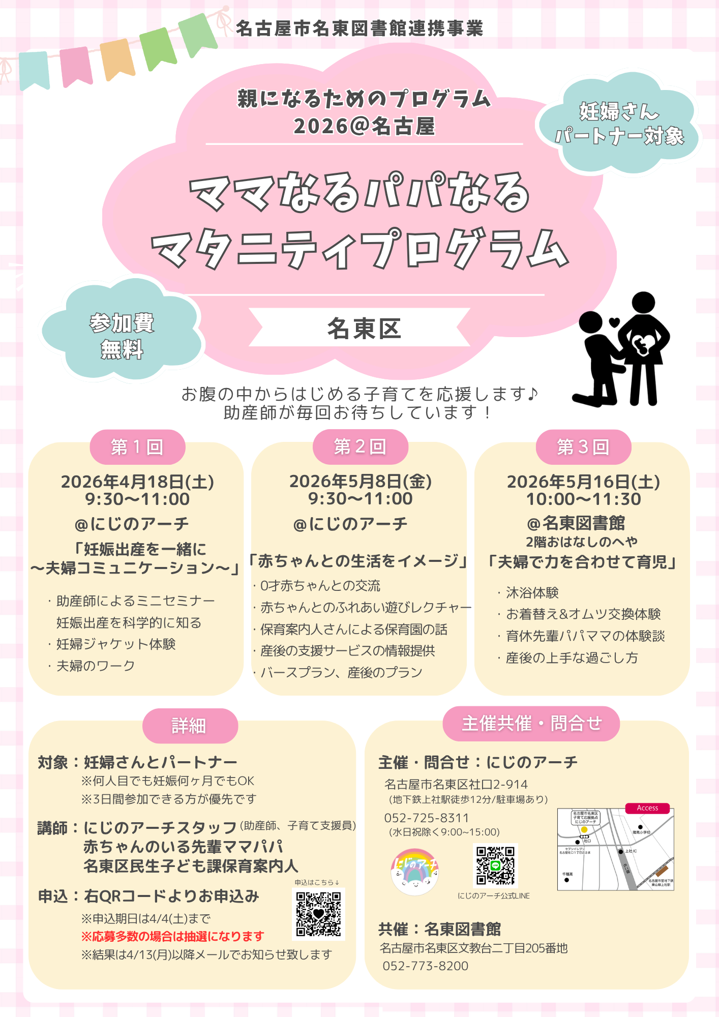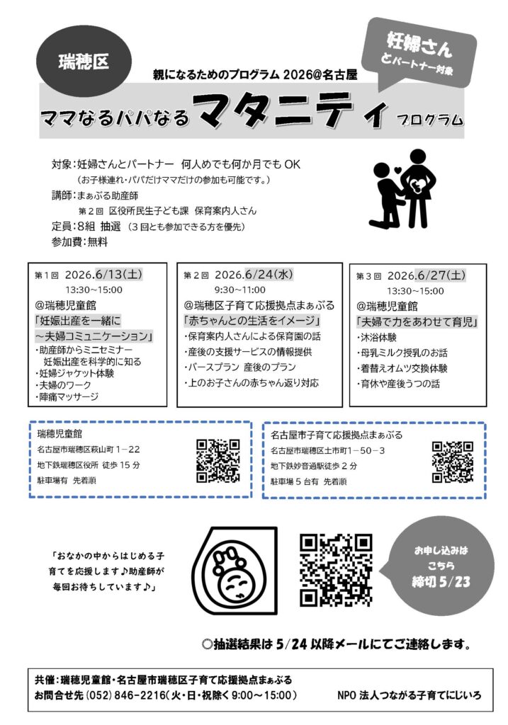 お問合せ:名古屋市瑞穂区子育て応援拠点まぁぶる 052-846-2216(火・日・祝以外の9:00~15:00) ninpu@nijiiro.nagoya