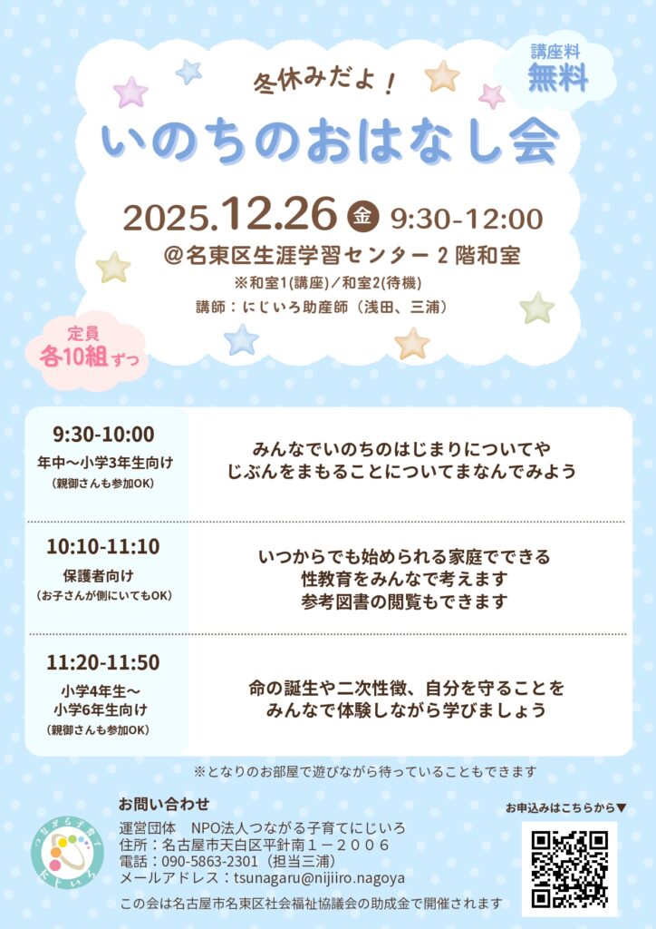 協賛:天白図書館 NPO法人つながる子育てにじいろお問い合わせ先:tsunagaru@nijiiro.nagoya (052)807-2720 月~金・日 9:00~14:30(土曜日祝日除く)